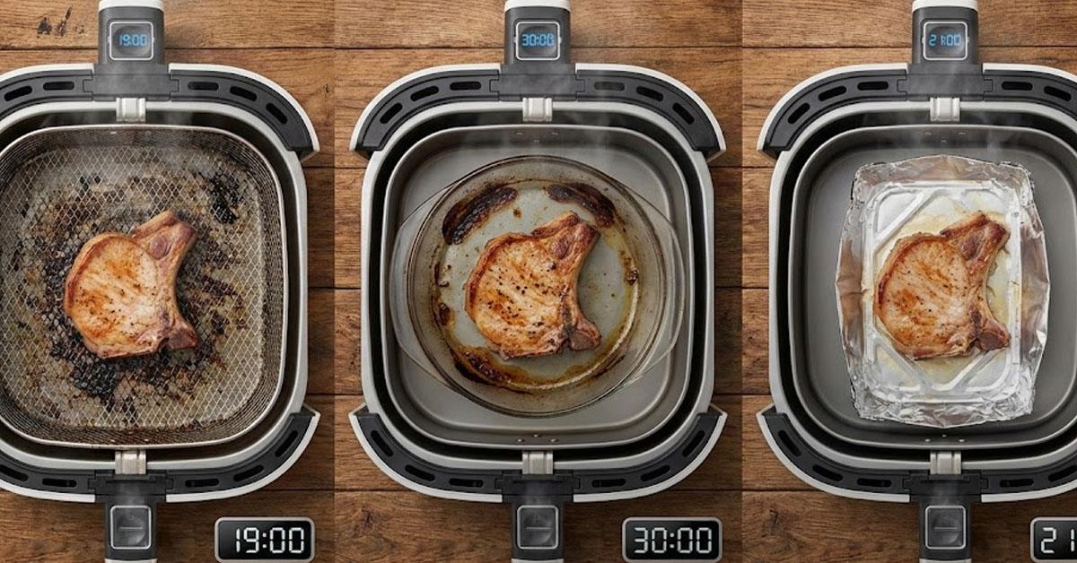 Quem nunca desistiu de fazer uma carne de porco deliciosa na Air Fryer só de pensar na crosta de gordura queimada que fica no cesto depois? Muitos recorrem ao prato de vidro temperado dentro da fritadeira para facilitar a limpeza, mas isso traz dois problemas: a gordura gruda no vidro e o tempo de cozimento aumenta.